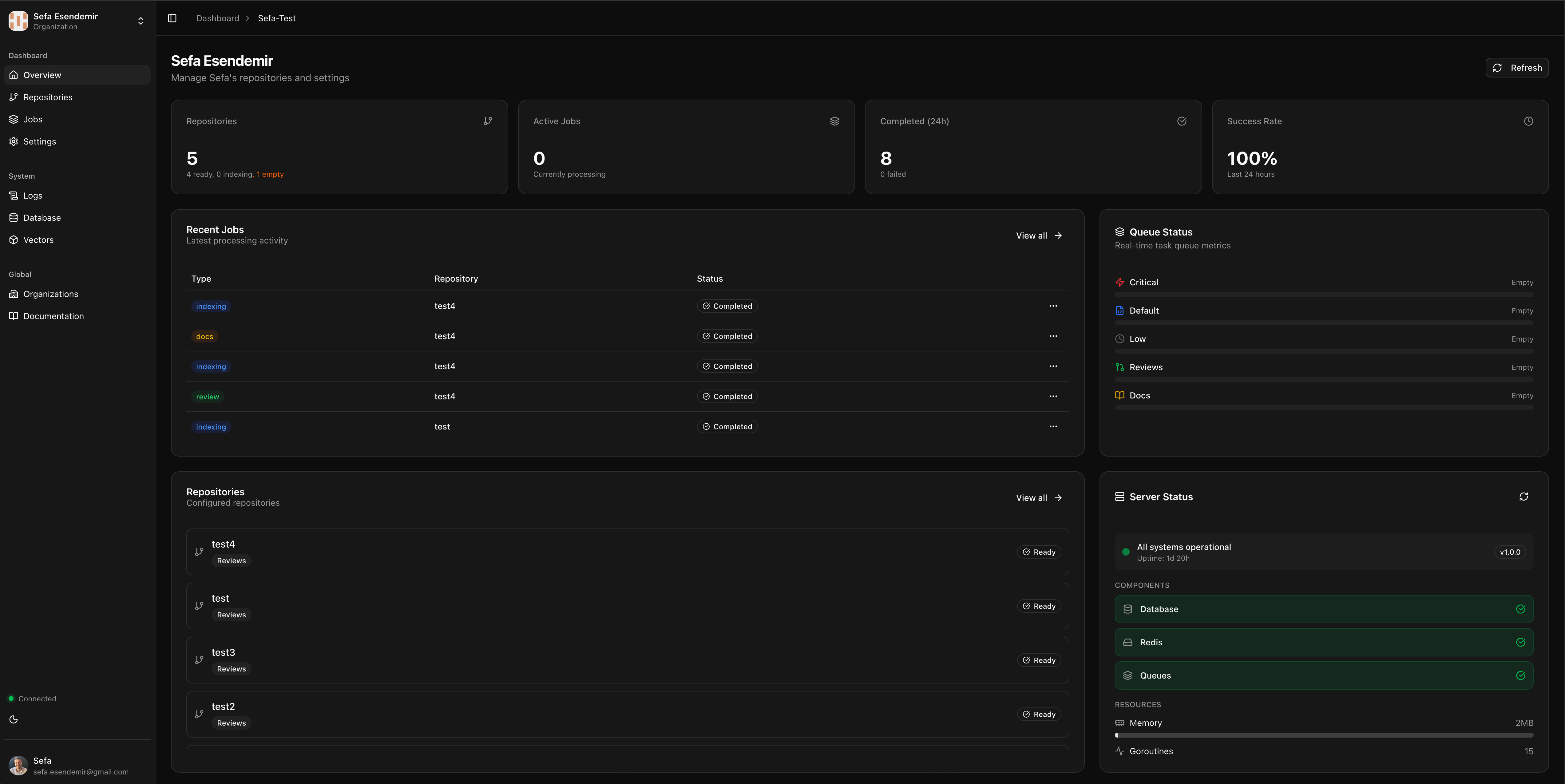 Real-time monitoring of repositories, job queues, server health, and processing activity